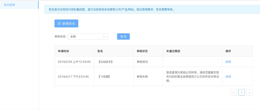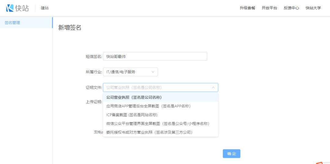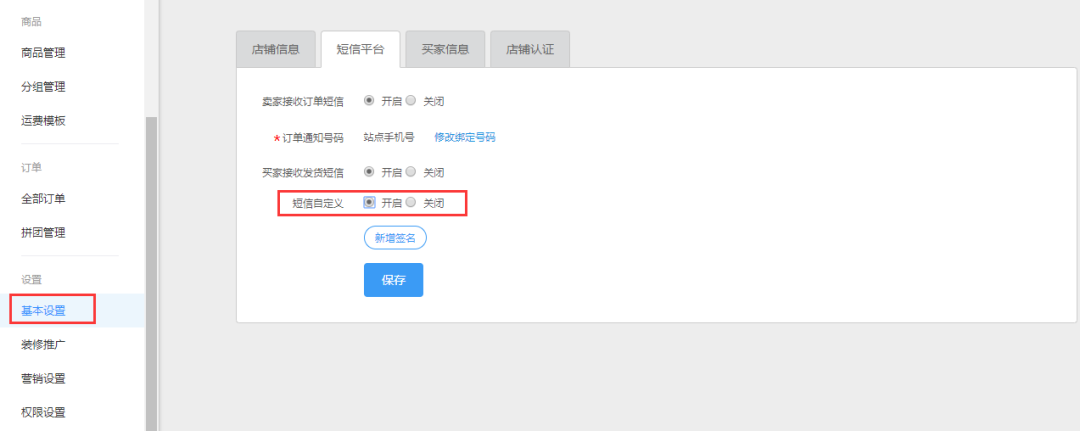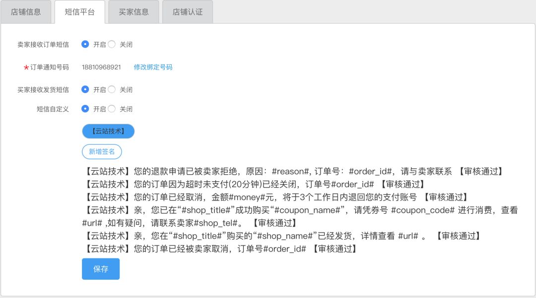 什么是短信自定义 开启快站电商【短信自定义】功能,商家可根据自己的产品/网站/公司名自定义短信抬头,如【云站技术】可修改为商家自己的店铺名称。 如何开通短信自定义 进入电商后台设置页面,点击【基本设置】,选择【短信平台】,开启【短信自定义】后新增签名。 2 填写签名信息,可以是公司/APP/网站/公众号/小程序等名称,须上传相关证明。 3 审核结果在【签名管理】页面以列表形式显示。如图,有申请时间、签名、审核状态、未通过原因、操作(可进行删除等操作)。 4 目前模板内容仅支持: ① 您的退款申请已被卖家拒绝... ② 您的订单因为超时未支付(20分钟)已经关闭... ③ 您的订单已经取消... ④ 亲,您已成功购买... ⑤ 亲,您购买的商品已经发货... ⑥ 您的订单已经被卖家取消... 关于【短信自定义】功能 1 开通快站尊享版套餐的站长可以使用电商短信自定义功能 2 签名显示在短信内容的最前面,显示短信来自哪家公司/网站/产品 3 因短信运营商要求,签名设置完成后需要进行审核,审核时长不超过一小时 4 如您有任何疑问,请拨打客服电话:400-780-9680 快去马不停蹄的开通自定义签名吧 即刻拥有自己的品牌标识~ 像搭积木一样,建一个网站