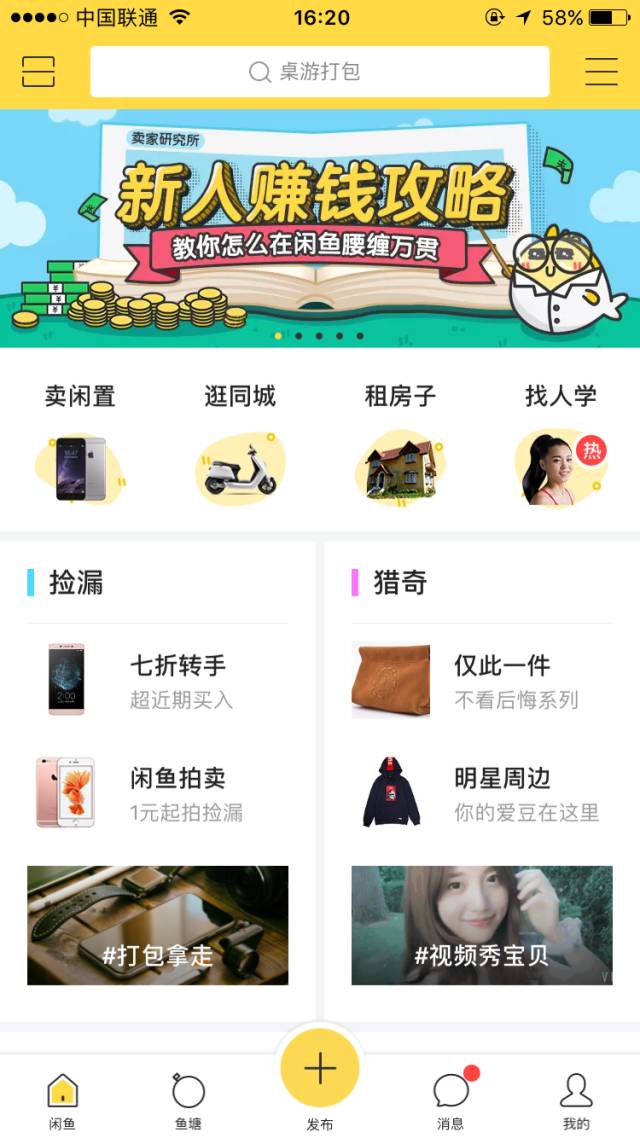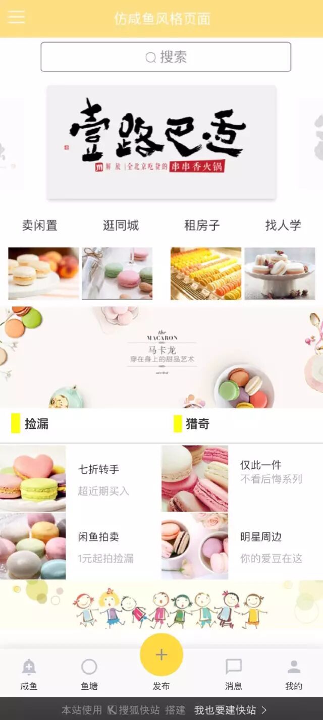 因此,哥邀请了一位闲出屁的快站热心群众,手把手来指导大家如何设计好看的页面,这次是仿咸鱼app页面的排版设计。 闲鱼APP页面 哥做的页面 闲鱼的页面并不复杂,以方块来堆积,用较浅的颜色及清新的图片,搭配给人很舒服的视觉效果。因此,在案例中哥选择了均为较浅颜色的马卡龙的图片来做搭配。 先给大家推荐一个网站(www.visualhunt.com),可以按照颜色标签来找图片,纠结图片来源的朋友们可以去搜索看看。 素材准备好之后,我们就开始搭建页面了! 1)选择导航样式 我选的是最后一个,是比较简洁的一个,页面中点左上角的三条线就会出现如图所示的导航。 2)增加搜索栏 搜索栏的大小可以通过设置双栏的比例达到。 第三步,设置滚动banner图片。 点击【内容】-【组图】-选择组图样式-插入图片,即可。 *高质量的图片可以很大程度提高页面的质感,也是可以吸引用户留存的关键步! 第四步,添加双栏,在双栏中再加入两次双栏,通过移动比例形成较为均匀的四栏,再插入图片及文字。 第五步,继续填充页面内容。 插入单张横图banner,在排版上更加整齐同时使画面柔美。之后类似于第四步再加入引导图片及文字。 最后一步,添加导航栏。 填充导航内容。