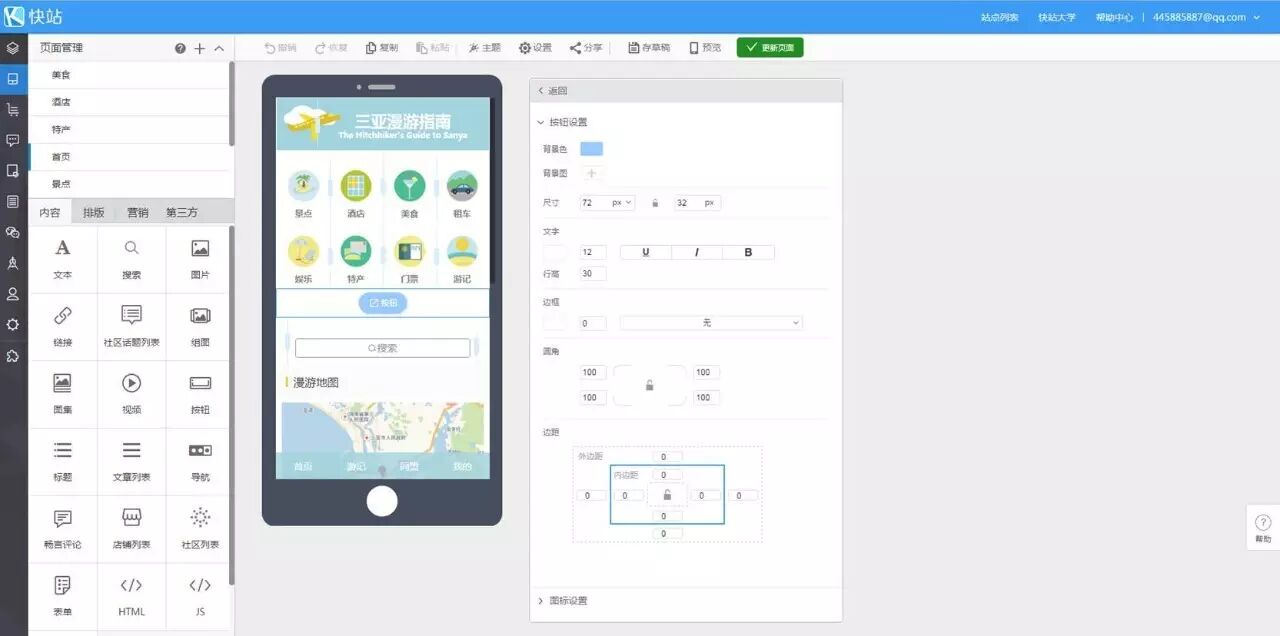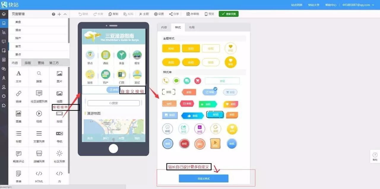 二、功能看点 1. 新增组件编辑器,支持更高自定义 2. 按钮组件增加样式库,支持更多样式 3. 新增图标库,大量可选图标并支持用户上传 三、步骤详解 1.拖入按钮组件,右侧出现编辑按钮的页面,如图所示; 若已有样式无法满足需求,点击自定义按式打开更多样式的按钮样板设计,站长们可以根据网站所想要的功能自行选择不同按钮。