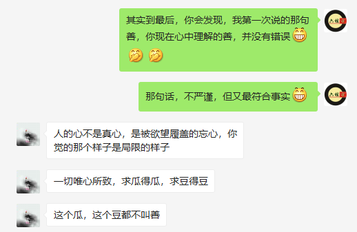 第二次的回答就是相对的世俗含义了,“做公正的事,维持这个世界的良性发展,就是善。”
