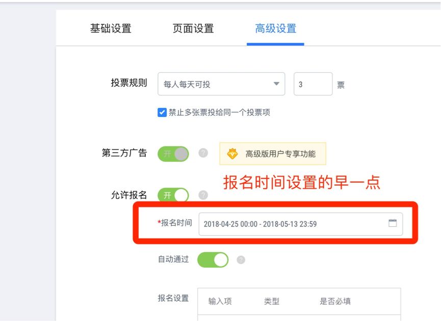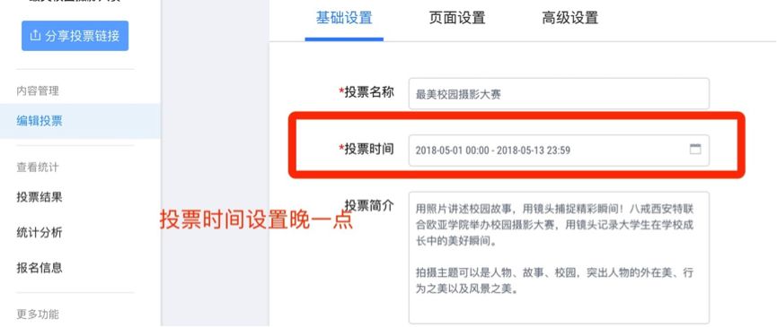 按照图片设置一下,把报名时间设置的早一点,投票时间设置的晚一点。