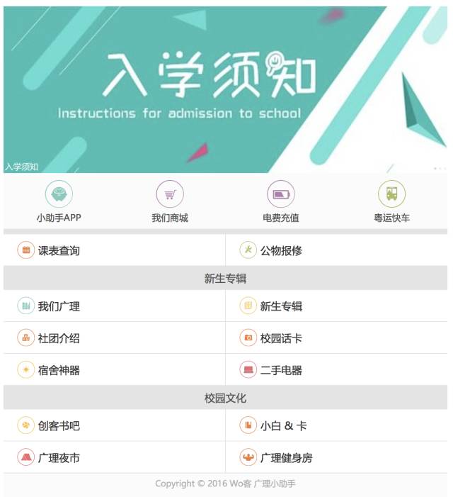 不过,通常这个时候院校的学生会、各个组织等就会起到非常重要的作用!现在院校都会在录取通知书上印有相关公众号二维码,以便新生了解自己的学习和生活环境。 那么,我们怎么能让这个情景的效益实现最大化呢? 1 一个完整、综合的介绍页面 学生从公众号的大量图文中选取对自己有用的信息非常困难,这个时候一个完整、综合的页面有助于他们加深对学校的了解。 从学校的官网来了解学校是最快速的方法。不过一般学校的官网都比较注重pc端的,移动端界面要么没有开发、要么很简陋。 ▲ 可以利用公众号的自定义菜单,插入移动官网 移动官网可以使用快站制作。 一般首页官网的内容版块包括:学校概况、新闻、教学成就、通知公告等。 2 提供学生交流沟通的渠道 在入学的时候,新生们互不熟悉,一般都是通过线上交流。这个时候,很多人都会选择到学校的贴吧去找微信群与qq群。 其实不必这么麻烦,只要在移动官网中加入一个社区入口即可。 在交流社区里,可以做新生交流、跳蚤市场,还可以发发吐槽牢骚、反馈问题建议。 3 便利学生的校园功能 广东理工学院使用快站搭建为学生服务的校园助手平台,有非常多实用功能:交电费、公物报修、校园公交卡、校园商城等。 长按识别进入wo客校园 其他 可以联合校园权威的官方组织(例如党委、团委、学工部、社团联合等),在宣传的时候可信度更高,更容易在学生中流通。 如果有同学不知道怎么制作这样的网站,快站有学校/教育类的网站模板可供选择哦! 直接进入云商店后,搜索“学校”即可。 名称:互联网+学校官网教育培训中学小学自媒体 名称:全套学校模版 完成了学校官网、完美地迎接了新生小鲜肉,我只想说: