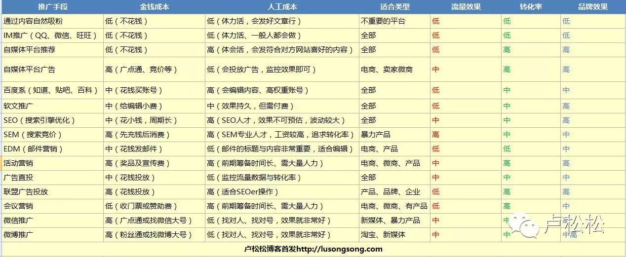 写在最后: 这个图对刚开始接触网络推广的公司有一定参考意义。因为自己经验有限,所以图中的推广效果评估也只能是参考,图中任何一种推广方法只要做到极致,它的品牌、转化都是非常高的。
