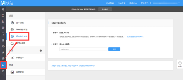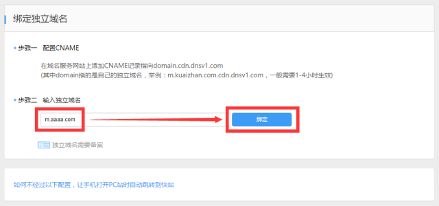 来认真学习! 独立域名到底是什么? 独立域名就是一个单独存在的域名,是独立的网页在互联网上的名称。通常由两个或两个以上的词构成,中间由点号分隔开。 例如搜狐网站www.sohu.com 其中的sohu.com 就是一个独立域名。 二级域名又是什么? 二级域名是寄存在独立域名之下的域名,权重低于其寄存的主域名,属于一个独立的分支,拥有自己的收录、快照、PR值、反链等。 例如www.kuaizhange.sohu.com 就是依存于sohu.com下的二级域名。 快站会给每位站长提供二级域名,在你们的站点发布后就可以用该域名访问了。想要独立域名的站长需要自行咨询域名服务提供商哦,快站目前不提供备案服务。 如果你拥有已经备案的独立域名, 继续往下读—— 为提升站长独立域名使用体验,快站将为站长的独立域名添加CDN加速服务。请大家按照以下最新步骤进行独立域名绑定。 进入快站【设置】>【绑定独立域名】,需要先配置cname。这一点在域名提供商的网站设置完成。我们接下来会以提供商万网作为例子。 先进行【步骤一】,配置cname 02 登陆后点击【会员中心】进入管理后台,点击【域名】>【域名列表】,再点击【进入域名解析列表】。 03 进入【域名解析】设置页面,点击【添加解析】进行设置。 请参考以下信息设置添加解析 记录类型:请选择CNAME 主机记录:请输入m(这里的m可为任意值) 解析线路:请选择默认 记录值:填写格式为“主机记录.一级域名.cdn.dnsv1.com”(例如:主机记录为“m”,一级域名为“aaaa.com”,则记录值需要填写“m.aaaa.com.cdn.dnsv1.com”) 04 点击保存后需要一定时间进行解析。解析生效后会出现提示信息: 05 现在回到第一步的设置页面,输入你的二级独立域名,例如:m.aaaa.com,点击绑定即可。 快站目前虽然不提供备案服务,但是在帮助中心为大家总结了一些域名服务提供商官网。 有备案需要的站长请戳【帮助中心】,查看页面底部的表格。 不用谢哥,如果爱哥记得点赞。