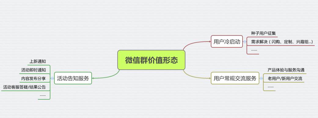 这里主要讨论微信群,除了因为微信群是目前蓄客圈层比较有力的工具之外,微信群产品对于移动端用户转化的体验比较好、路径相对短。想要运营好微信群,就需要先了解目前微信群存在的常规价值形态: